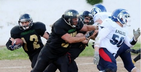 La cronaca vede infatti il match aprirsi con il touchdown di Luca Giordano, furbo ad intercettare la palla lanciata dal regista pugliese ed a depositarla in meta con l’aiuto dei compagni di reparto. Il primo tempo si chiude sul 14-0 per i padroni di casa, grazie alla prima realizzazione della giornata di Marco Megna ma è nella seconda frazione di gioco che i nero oro, che oramai hanno il pieno controllo della partita, dilagano con altre due segnature di Marco Megna, di cui una su intercetto e due mete del runningback Consuele Morrone, con il reparto di attacco diretto magistralmente dal regista Petrullo, nominato miglior giocatore in assoluto della partita.