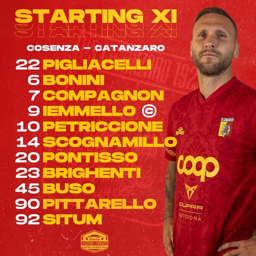 Il tecnico melitese conferma i tre di difesa, ma opera delle scelte particolari nella zona centrale, con l’uscita di Pompetti, sostituito da Nicolò Buso, e in attacco, con Filippo Pittarello al posto di Biasci. Rientra da titolare Mario Situm, che prende il posto di Cassandro.