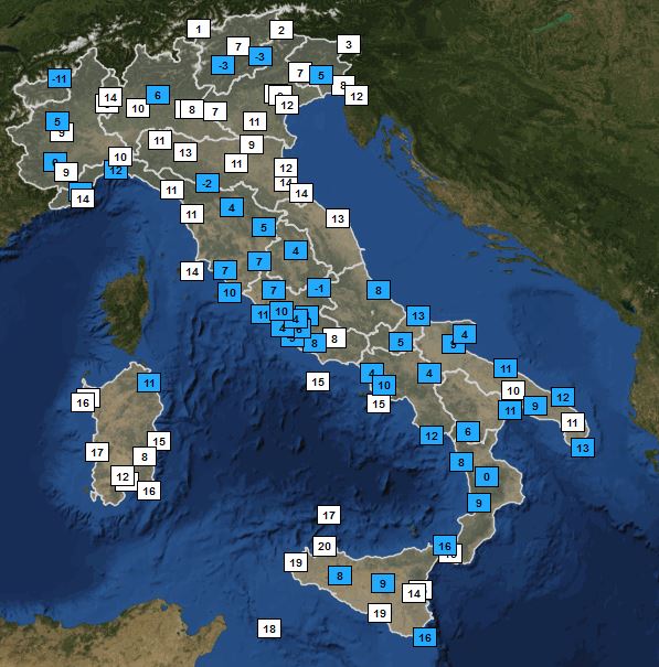 In particolare modo, alle ore 7:25, spiccano i +4°C di Firenze, Perugia, Roma Urbe, Fiumicino, Guidonia e Grazzanise, i +5°C di Torino, Arezzo e Campobasso.