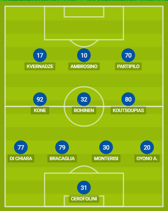 FROSINONE (4-3-3): 31 Cerofolini; 20 Oyono A., 30 Monterisi, 79 Bracaglia, 77 Di Chiara; 80 Koutsoupias, 32 Bohinen, 92 Kone; 70 Partipilo, 10 Ambrosino, 17 Kvernadze. A disposizione: 13 Sorrentino, 15 Lucioni, 47 Lusuardi, 21 Oyono J., 8 Vural, 11 Begic, 37 Barcella, 55 Darboe, 64 Cichella, 7 Ghedjemis, 74 Tsadjout, 90 Pecorino. Allenatore: Greco.