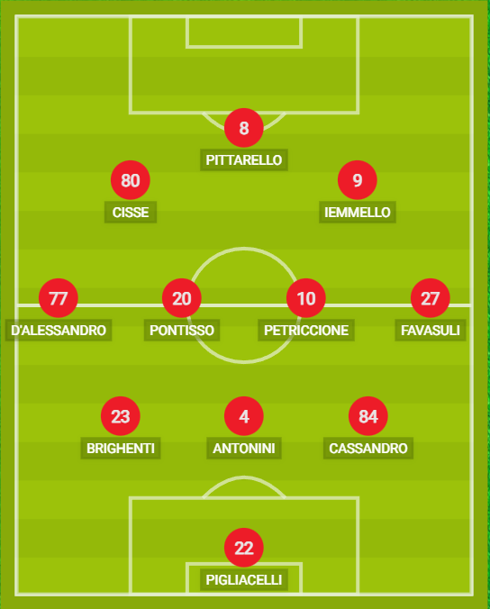 CATANZARO (3-4-2-1): 22 Pigliacelli; 84 Cassandro, 4 Antonini, 23 Brighenti; 27 Favasulii, 10 Petriccione, 20 Pontisso, 77 D’Alessandro; 9 Iemmello, 80 Cisse; 8 Pittarello. A disposizione: 1 Marietta, 17 Di Chiara, 18 Bettella, 26 Verrengia, 62 Frosinini, 14 Liberali, 30 Alesi, 32 Rispoli, 98 Buglio, 7 Pandolfi, 19 Nuamah, 45 Buso. Allenatore: Aquilani.