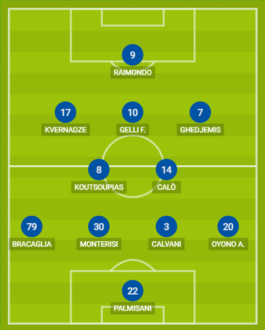 FROSINONE (4-2-3-1): 22 Palmisani; 20 Oyono A., 3 Calvani, 30 Monterisi, 79 Bracaglia; 14 Calò, 8 Koutsoupias; 7 Ghedjemis, 10 Gelli F., 17 Kvernadze; 9 Raimondo. A disposizione: 75 Pisseri, 2 Cittadini, 4 Biraschi, 5 Marchizza, 21 Oyono J., 16 Cichella, 18 Grosso, 92 Kone, 99 Barcella, 19 Corrado, 28 Zilli, 90 Vergani. Allenatore: Alvini.