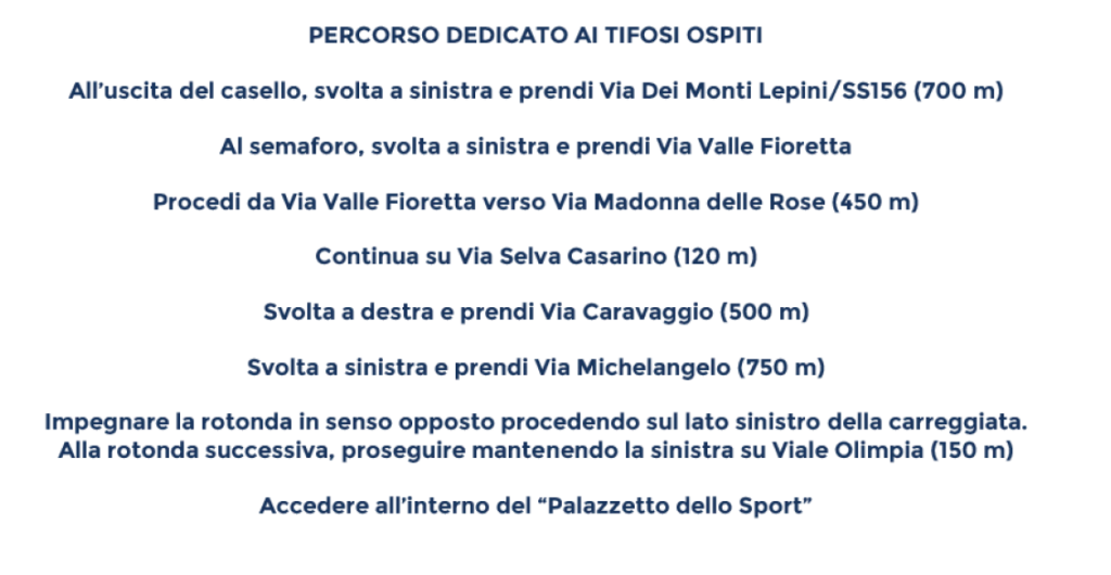 La società Frosinone Calcio chiede a tutti i supporter giallorossi di seguire le indicazioni stradali dal casello autostradale di Frosinone fino al Palazzetto dello Sport, nei cui pressi dovranno essere parcheggiati tutti i mezzi, indipendentemente dal settore acquistato, compresi quelli degli accreditati dell’US Catanzaro 1929. All’uscita del casello autostradale ci saranno le forze dell’ordine che indicheranno la strada per raggiungere il parcheggio del Palazzetto dello Sport. Si consiglia di arrivare al parcheggio almeno un’ora e mezza prima dell’inizio della gara.