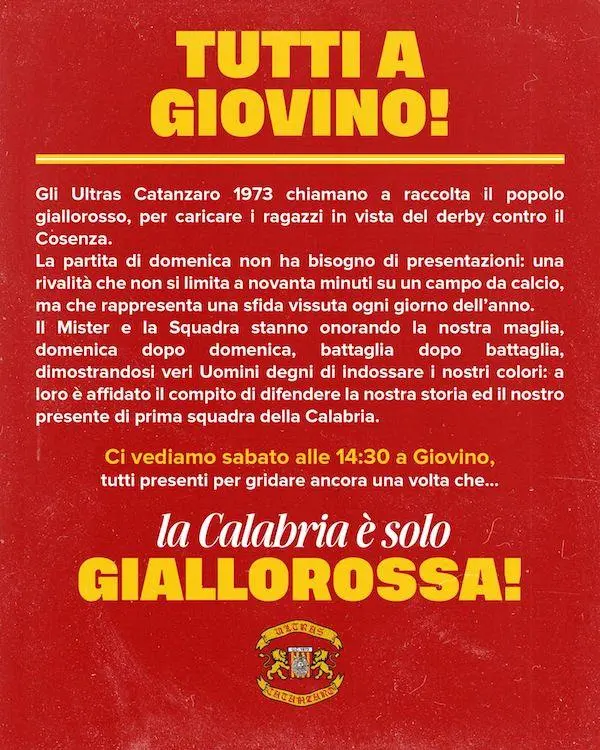 Ma non è tutto. Anche gli Ultras del Catanzaro sono in fermento e, attraverso un comunicato ufficiale, hanno invitato i tifosi giallorossi a partecipare alla rifinitura della squadra, che avrà luogo sabato alle 14,30 presso il Centro Sportivo del Poligiovino per ribadire ancora una volta che “La Calabria è solo GIALLOROSSA!”.
