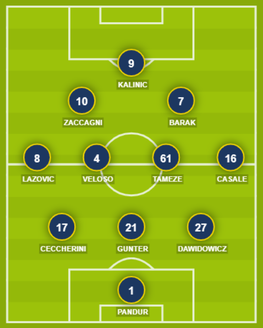 HELLAS VERONA (3-4-2-1): 1 Pandur; 27 Dawidowicz, 21 Gunter, 17 Ceccherini; 16 Casale, 61 Tameze, 4 Veloso, 8 Lazovic; 7 Barak, 10 Zaccagni; 9 Kalinic. A disposizione: 12 Borghetto, 22 Berardi, 3 Amione, 15 Cetin, 23 Magnani, 30 Frabotta, 24 Bessa, 63 Turra, 78 Hongla, 18 Cancellieri, 32 Ragusa, 99 Di Carmine. Allenatore: Di Francesco.