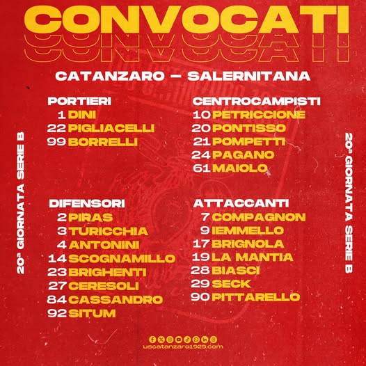 I convocati di Mister Caserta per la gara di domani con il Cosenza.