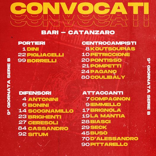 Al termine della rifinitura odierna e prima della partenza per il capoluogo pugliese, Fabio Caserta ha convocato 25 giocatori in vista della disputa dell’incontro di venerdì 18 alle 20:30 al San Nicola di Bari.