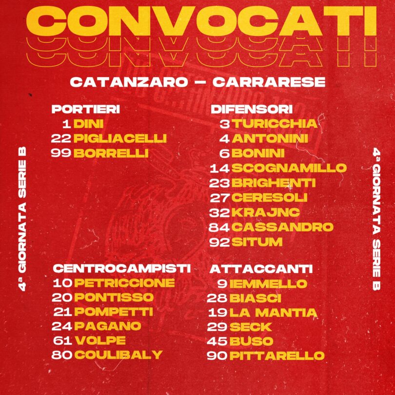 Sono 24 i giocatori scelti da Fabio Caserta per la sfida di domenica 1 Settembre contro la neo-promossa Carrarese di Antonio Calabro.