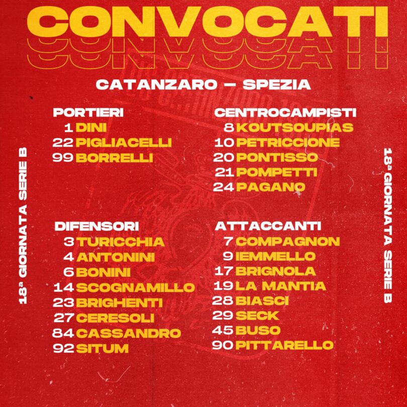 Gli assenti per infortunio sono quelli noti: Marco D’Alessandro e Mamadou Coulibaly. Non convocati i giovani Marcello Piras, Philipp Breit e Giovanni Volpe.