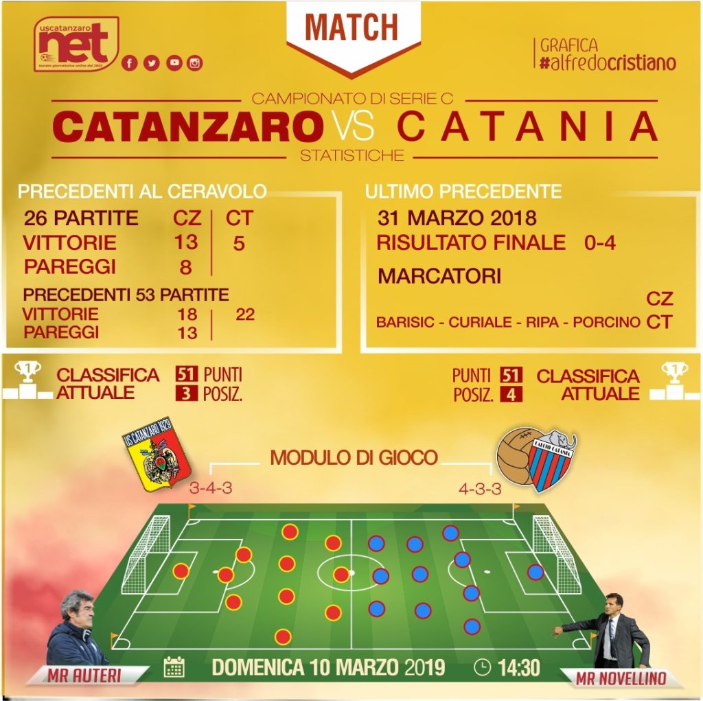 Larghissimo successo dei rossoazzurri nella scorsa stagione il 31 marzo 2018 per 0-4. Tutti i gol nella ripresa a firma di Barisic, Curiale, Ripa e Porcino. Il 2 aprile 2017 vinse il Catanzaro 2-1 con reti di Sarao al 6’ e Giovinco al 23’; di Mazzarani al 31’ la rete degli ospiti. A reti inviolate l’incontro del 21 febbraio 2016. Le squadre non si affrontavano dalla breve parentesi di due stagioni (da dimenticare) delle aquile in Serie B. Nel 2005-2006 sul neutro di Lecce finì 1-3 con gol di Mascara al 17, Caserta al 31’; Mattioli per il Catanzaro al 50’; ancora Mascara al 72’. Vittoria etnea anche nel campionato precedente con un rocambolesco 2-3. Aprì Manfredini con un lancio dalla difesa non toccato né da Bruno né da Lafuenti in uscita al 16’; pareggio di Corona su rigore al 22’; sempre dal dischetto vantaggio giallorosso ad opera di Carbone ad inizio ripresa; il terzo penalty di giornata lo realizzò Edy Baggio al 59’; gol vittoria di Bruno al 61’. Rete dubbia annullata a Corona per fuorigioco. Il 13 settembre 1998 finì 1-1 con Marsich che rispose a Brutto. Il primo incontro è datato 8 marzo 1931 ed è terminato 3-1 per il Catanzaro.
