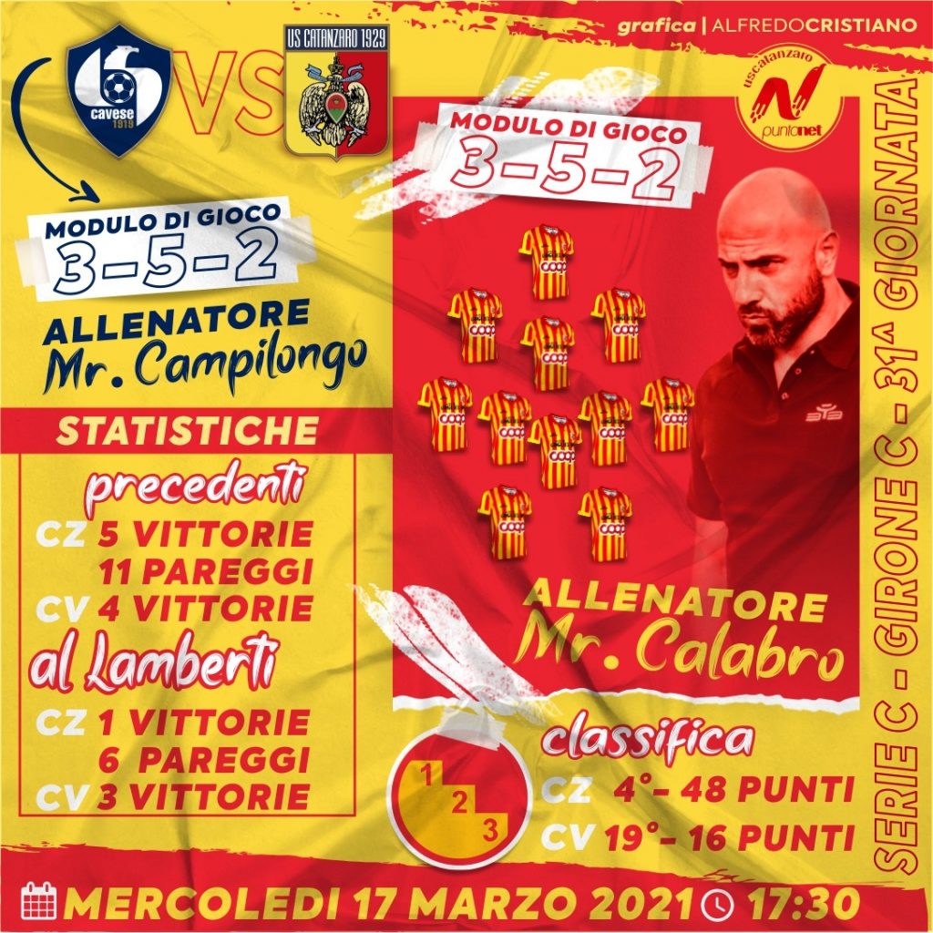 Turno infrasettimanale per il Catanzaro che sarà  impegnato in casa dell’ultima in classifica, la Cavese. I giallorossi sono tornati a vincere sabato contro la Virtus Francavilla per 1-0 e hanno puntato il terzo posto occupato dal Bari. Proprio i pugliesi saranno di scena al “Ceravolo” domenica 21 marzo.