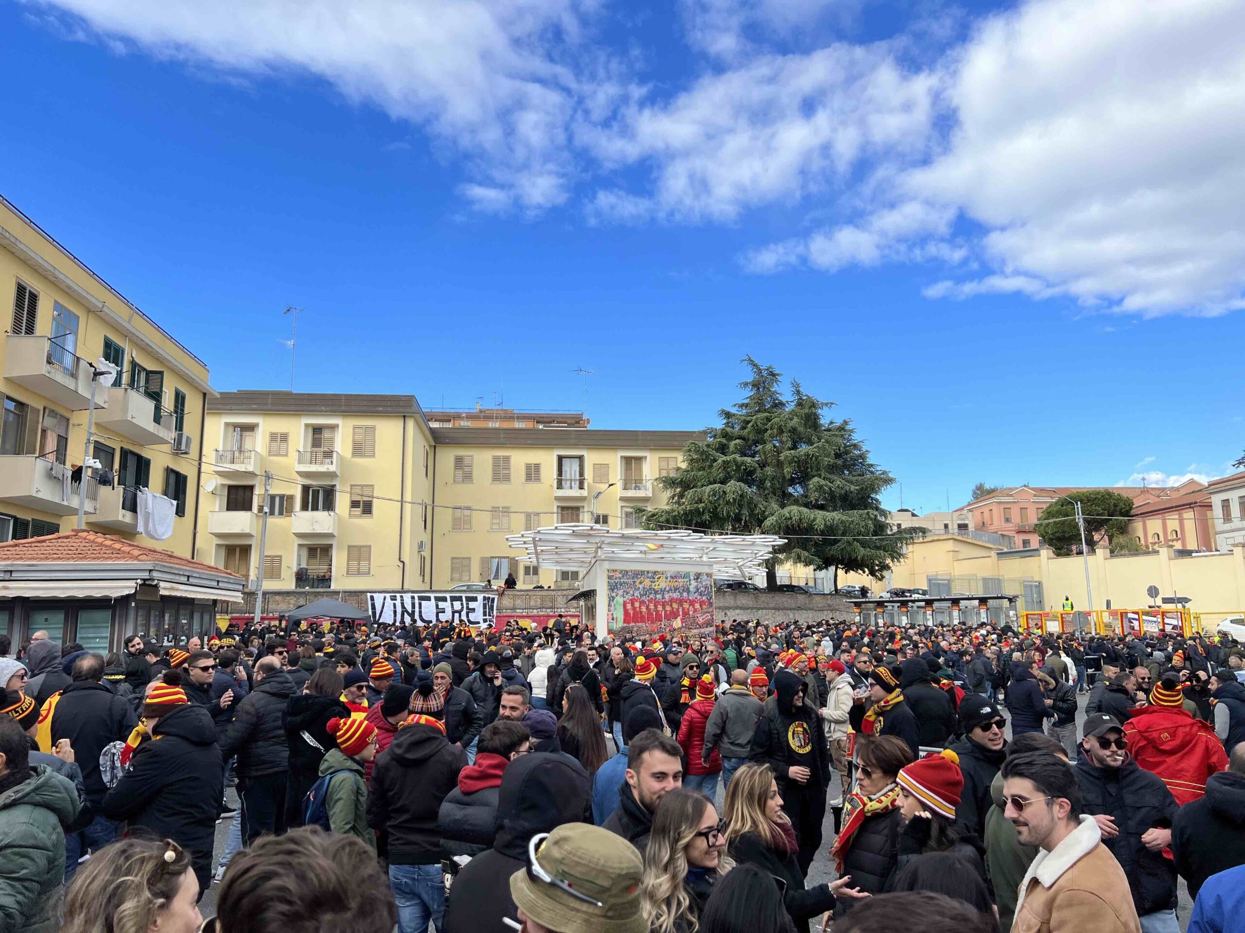 Catanzaro è mobilitata dal mattino per l’evento, tra passione e ordine pubblico. Il piazzale della biglietteria pullula di gente già da mezzogiorno. Quando le squadre entrano in campo per tastare il terreno di gioco lo stadio è quasi pieno. Scroscianti applausi accolgono i calciatori giallorossi, bordate di fischi per quelli rossoblù. Da segnalare un episodio che racconta un po’ il clima del derby. Tutino, con un sorrisetto ironico e qualche gesto, provoca la curva “Capraro” dove risiede la parte più calda del tifo giallorosso. L’attaccante viene richiamato e allontanato per evitare che la tensione si alzi ancor di più.