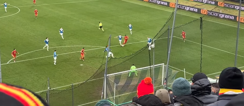 Passano tre minuti e c’è un episodio che andrebbe rivisto: ripartenza del Catanzaro, con Buso che trova un filtrante per Iemmello, che s’infila tra le maglie della difesa bresciana ed entra in area palla al piede. Bisoli lo contrasta, spingendogli una spalla con la mano e toccandolo sul piede destro, ma per Ferrieri Caputi non ci sono gli estremi per un nuovo rigore. Come potete vedere dall’immagine di copertina, ripresa dal settore ospiti, il doppio contatto c’è, ma per il VAR non è disponibile alcuna immagine da dietro le porte, a causa della gestione “al risparmio” della produzione audiovisiva di questa stagione e dei prossimi due tornei di Serie B.