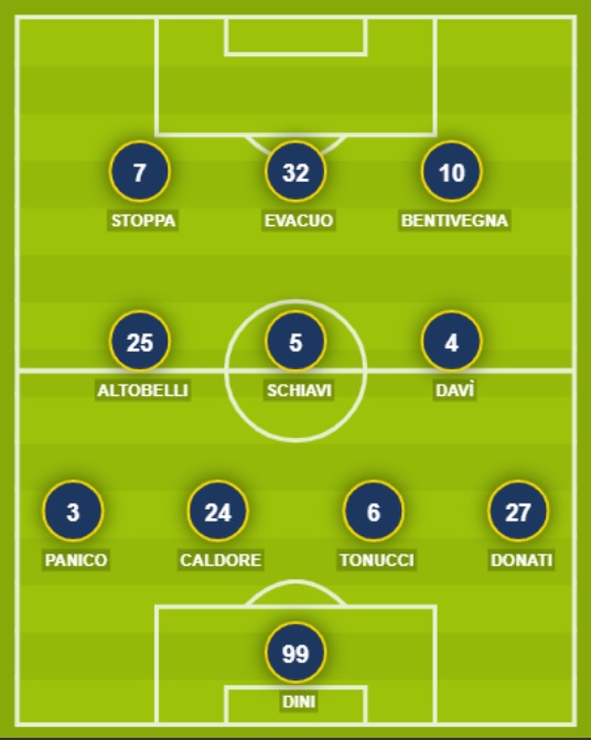 JUVE STABIA (4-3-3): 99 Dini; 27 Donati, 6 Tonucci, 24 Caldore, 3 Panico; 4 Davì, 5 Schiavi, 25 Altobelli; 10 Bentivegna, 32 Evacuo, 7 Stoppa. A disposizione: 22 Pozzer, 2 Peluso, 13 Dell’Orfanello, 20 Troest, 21 Cinaglia, 28 Esposito, 8 Scaccabarozzi, 14 Erradi, 17 Guarracino, 11 De Silvestro, 18 Della Pietra, 30 Ceccarelli. Allenatore: Novellino.