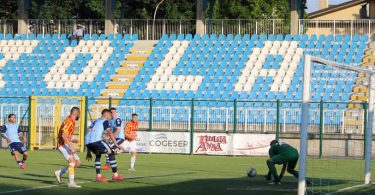 Fa caldo a Gorgonzola, e i primi minuti sono di studio. Le squadre si temono. Le emozioni sono poche. Di Gennaro deve intervenire su una girata di destro prevedibile di Manconi. L’occasione più ghiotta per i giallorossi arriva alla mezzora, quando un fendente di Porcino dalla sinistra pesca Carlini che non trova il tempo giusto per spingere in rete. Lo 0-0 del primo tempo è corretto e prevedibile per quanto si è visto in campo.