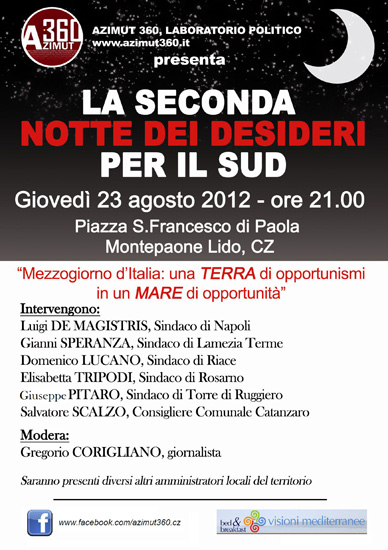 La cittadinanza tutta è invitata a partecipare giovedì 23 agosto alle ore 21.00 in Piazza S. Francesco di Paola a Montepaone Lido (CZ) alla seconda edizione di “La notte dei desideri per il Sud”.
