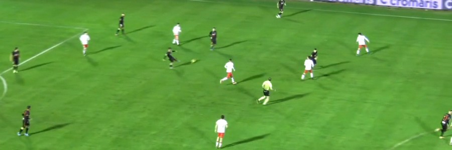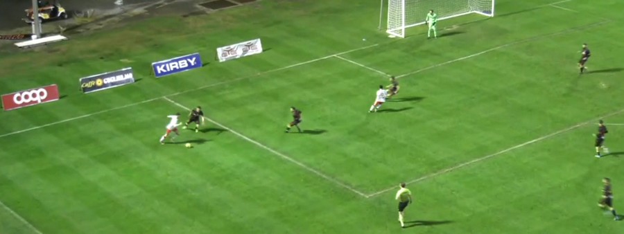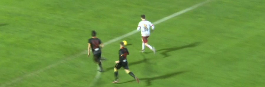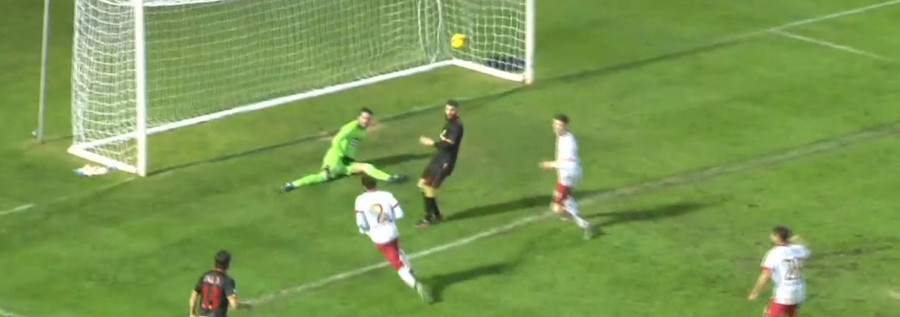 Gol di buona fattura, ma quello che è più interessante è il movimento di Giannone che parte decentrato sulla destra e taglia trasversalmente la trequarti fra le due linee giallorosse. Un movimento orizzontale che non viene contrastato a dovere perché la retroguardia giallorossa si concentra sulla posizione di Pandolfi, la verticale di Romano, i tagli di Esempio e Da Dalt.