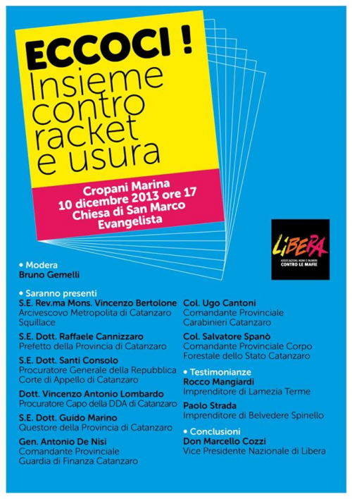 “Libera Catanzaro” comincia a impegnarsi concretamente sul territorio con una iniziativa che si terrà a Cropani il prossimo 10 dicembre. Il paese della costa ionica catanzarese è stato scelto perché diversi elementi, investigativi e non, indicano questa zona del catanzarese come quella più esposta, in questo momento, alla violenza della criminalità organizzata e ai fenomeni del racket e dell’usura.