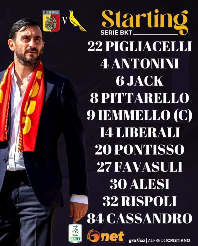 CATANZARO (3-4-2-1): 22 Pigliacelli; 6 Fellipe Jack, 4 Antonini, 84 Cassandro; 27 Favasuli, 20 Pontisso, 32 Rispoli, 30 Alesi; 14 Liberali; 9 Iemmello; 8 Pittarello A disposizione: 1 Marietta, 2 Esteves, 5 Bashi, Verrengia 62 Frosinini, 26 Verrengia, 21 Pompetti, 28 Oudin, 98 Buglio; 39 Koffi; 81 Ardizzone. Allenatore: Aquilani