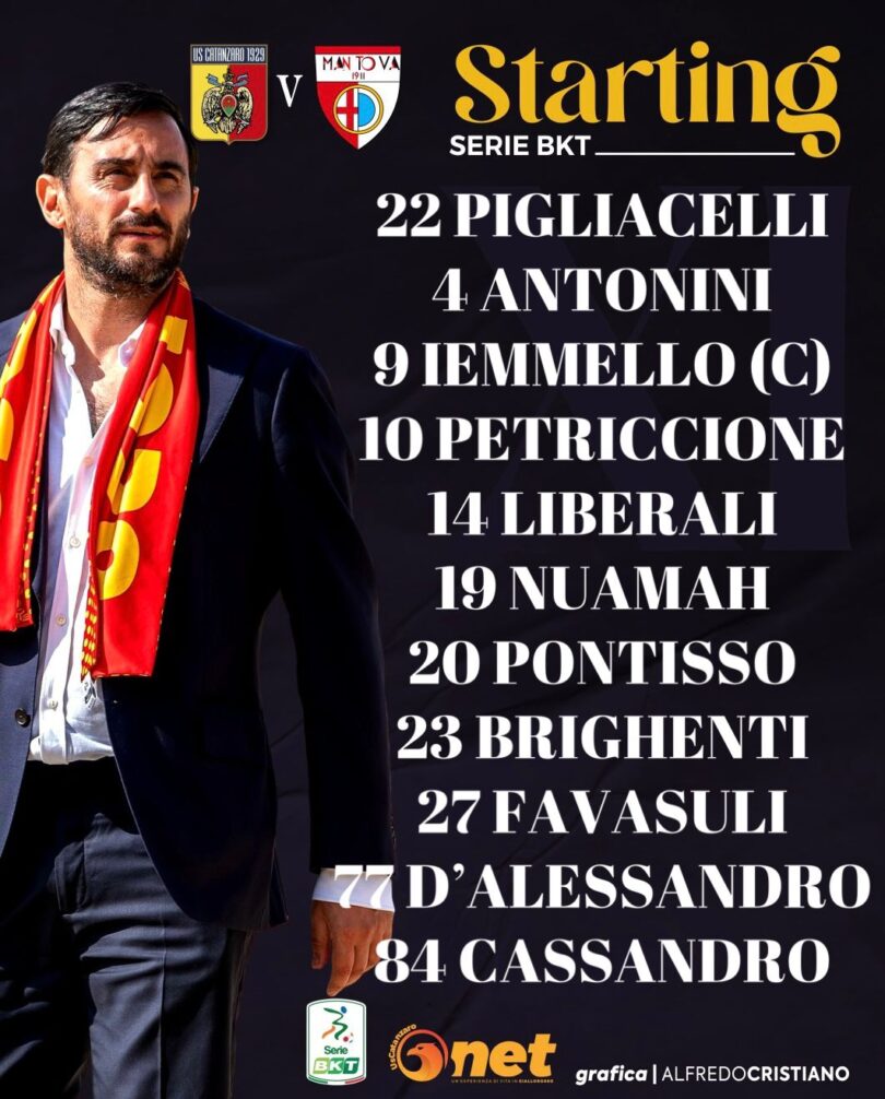 CATANZARO (3-4-2-1): 22 Pigliacelli; 84 Cassandro, 4 Antonini, 23 Brighenti; 27 Favasuli, 20 Pontisso, 10 Petriccione, 77 D’Alessandro; 14 Liberali, 19 Nuamah; 9 Iemmello. A disposizione: 1 Marietta, 3 Esteves, 5 Bashi, 6 Fellipe Jack, 26 Verrengia, 62 Frosinini, 21 Pompetti, 30 Alesi, 32 Rispoli, 98 Buglio, 39 Koffi, 94 Di Francesco. Allenatore: Aquilani.