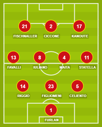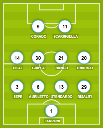 CATANZARO (3-4-3): 1 Furlan; 5 Celiento, 23 Figliomeni, 14 Riggio; 11 Statella, 4 Maita, 8 Iuliano, 13 Favalli; 17 Kanoute, 2 Ciccone, 21 Fischnaller. A disposizione: 12 Elezaj, 22 Mittica, 15 Signorini, 20 Lame, 6 Nicoletti, 18 Nikolopoulos, 16 Eklu, 7 D’Ursi, 10 Giannone, 27 Repossi, 9 Infantino. Allenatore: Auteri.