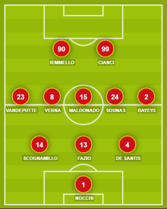 CATANZARO (3-5-2): 1 Nocchi; 4 De Santis, 13 Fazio, 14 Scognamillo; 2 Bayeye, 24 Sounas, 15 Maldonado, 8 Verna, 23 Vandeputte; 99 Cianci, 90 Iemmello. A disposizione: 12 Romagnoli, 44 Gatti, 3 Tentardini, 6 Welbeck, 18 Cinelli, 19 Bjarkason, 77 Rolando, 10 Bombagi, 9 Vazquez, 28 Biasci, 29 Carlini. Allenatore: Vivarini.