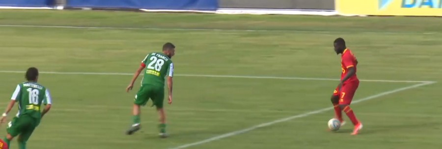E dunque arriviamo al 50esimo, ripartenza micidiale dei giallorossi e palla per Kanoutè che decide di far tutto da solo, poco fuori dal vertice sinistro dell’area di rigore pigia il tasto del NOS e supera sullo scatto l’esperto De Franco per poi scaricare in porta un siluro imprendibile. Partita sbloccata.