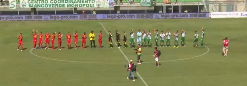 Il Monopoli è sceso in campo con un buon 3-5-2 che vedeva Antonino fra i pali, Maestrelli De Franco e Ferrara in difesa, Donnarumma Giorno Piccinni Carrero e Tazzer sulla mediana, Moreo e Jefferson in avanti.