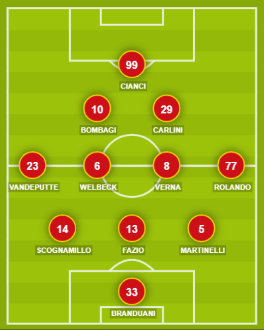 CATANZARO (3-4-2-1): 33 Branduani; 5 Martinelli, 13 Fazio, 14 Scognamillo; 77 Rolando, 8 Verna, 6 Welbeck, 23 Vandeputte; 10 Bombagi, 29 Carlini; 99 Cianci. A disposizione: 1 Nocchi, 12 Romagnoli, 4 De Santis, 15 Monterisi, 44 Gatti, 3 Tentardini, 17 Porcino, 18 Cinelli, 21 Risolo, 37 Bearzotti, 7 Curiale, 9 Vazquez. Allenatore: Calabro.