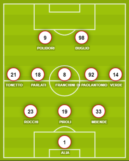 MONTEROSI (3-5-2): 1 Alia; 33 Mbende, 19 Piroli, 23 Rocchi; 14 Verde, 92 Di Paolantonio, 8 Franchini, 18 Parlati, 21 Tonetto; 98 Buglio, 9 Polidori. A disposizione: 22 Marcianò, 55 Basile, 3 Cancellieri, 6 Borri, 7 Polito, 16 Tartaglia, 5 Buono, 28 Sdaigui, 13 Tripoli, 17 Adamo, 20 Nasini, 99 Caon. Allenatore: Menichini.