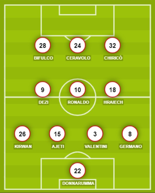 PADOVA (4-3-3): 22 Donnarumma; 8 Germano, 3 Valentini, 15 Ajeti, 26 Kirwan; 18 Hraiech, 10 Ronaldo, 9 Dezi; 32 Chiricò, 24 Ceravolo, 28 Bifulco. A disposizione: 1 Vannucchi, 6 Pelagatti, 4 Gasbarro, 27 Curcio, 29 Monaco, 5 Della Latta, 21 Settembrini, 7 Santini, 11 Jelenic, 13 Cissè, 17 Terrani, 20 Nicastro. Allenatore: Oddo.