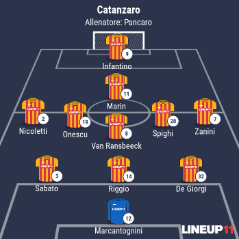 CATANZARO (3-5-1-1): 12 Marcantognini; 32 De Giorgi, 14 Riggio, 3 Sabato; 7 Zanini, 20 Spighi, 8 Van Ransbeeck, 19 Onescu, 2 Nicoletti; 11 Marin; 9 Infantino. A disposizione: 1 Nordi, 29 De Pace, 33 Sepe, 5 Maita, 24 Badjie, 30 Ielo, 26 Puntoriere, 37 Fania, 34 Corado. Allenatore: Pancaro.