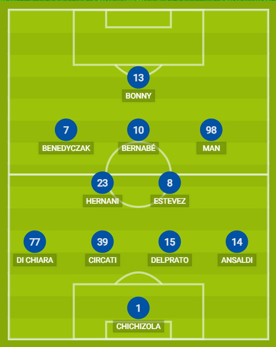 PARMA (4-2-3-1): 1 Chichizola; 14 Ansaldi, 15 Delprato, 39 Circati, 77 Di Chiara; 8 Estevez, 23 Hernani; 98 Man, 10 Bernabé, 7 Benedyczak; 13 Bonny. A disposizione: 40 Corvi, 22 Turk, 30 Valenti, 47 Zagaritis, 20 Hainaut, 23 Camara, 64 Cyprien, 9 Charpentier, 11 Begic, 19 Sohm, 17 Colak, 21 Partipilo, 28 Mihaila. Allenatore: Pecchia.