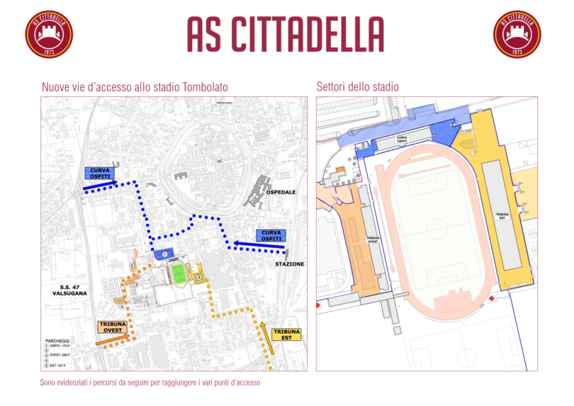 La capienza del settore ospiti è di 1144 posti. Nell’immagine sono evidenziati i percorsi per raggiungere la Curva Nord dalla statale 47 Valsugana e dalla stazione ferroviaria di Cittadella.