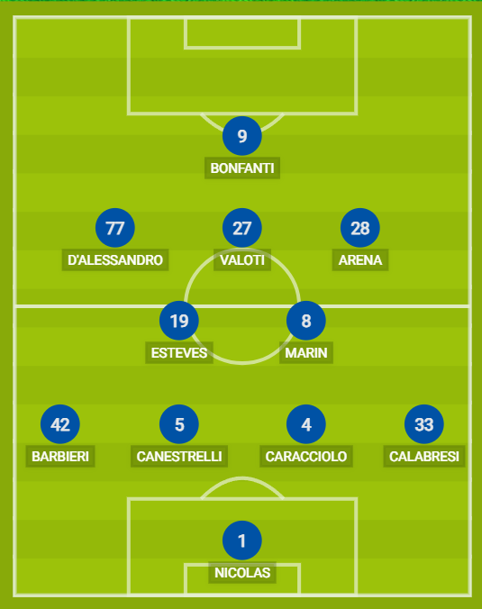 Indipsonibili: Veloso. Squalificati: nessuno. Diffidati: Beruatto, Moreo, Calabresi, Piccinini, Veloso.