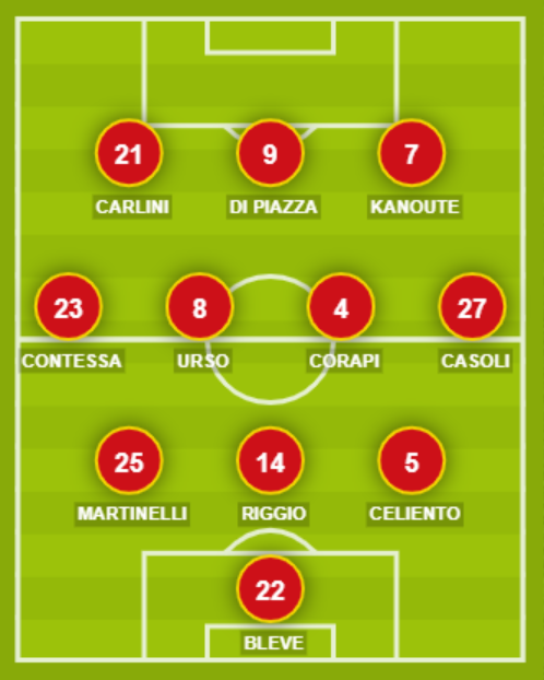 CATANZARO (3-4-3): 22 Bleve; 5 Celiento, 14 Riggio, 25 Martinelli; 27 Casoli, 4 Corapi, 8 Urso, 23 Contessa; 7 Kanoute, 9 Di Piazza, 21 Carlini. A disposizione: 12 Mittica, 6 Nicoletti, 11 Statella, 28 Iuliano, 32 Bayeye, 10 Giannone, 17 Novello, 18 Bianchimano. Allenatore: Auteri.