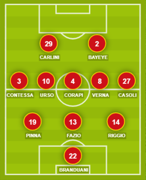 CATANZARO (3-5-2): 22 Branduani; 14 Riggio, 13 Fazio, 19 Pinna; 27 Casoli, 8 Verna, 4 Corapi, 10 Urso, 3 Contessa; 2 Bayeye, 29 Carlini. A disposizione: 1 Mittica, 12 Iannì, 5 Martinelli, 31 Brugnano, 16 Mirarchi, 21 Risolo, 28 Iseppon, 9 Di Piazza, 24 Cristiano, 25 Cusumano. Allenatore: Calabro.