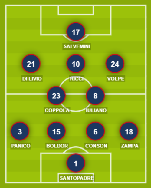 POTENZA (4-2-3-1): 1 Santopadre; 18 Zampa, 6 Conson, 15 Boldor, 3 Panico; 8 Iuliano, 23 Coppola; 24 Volpe, 10 Ricci, 21 Di Livio; 17 Salvemini. A disposizione: 12 Brescia, 2 Viterittti, 20 Fontana, 27 Spedalieri, 28 Lorusso, 30 Gassama, 4 Sandri, 7 Coccia, 11 Compagnon, 19 Nigro, 9 Cianci, 16 Baclet. Allenatore: Somma.