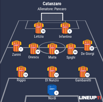 CATANZARO (3-5-2): 1 Nordi; 13 Gambaretti, 17 Di Nunzio, 14 Riggio; 32 De Giorgi, 19 Onescu, 5 Maita, 20 Spighi, 7 Zanini; 9 Infantino, 18 Letizia. A disposizione: 12 Marcantognini, 3 Sabato, 2 Nicoletti, 33 Sepe, 8 Van Ransbeeck, 24 Badjie, 11 Marin, 26 Puntoriere, 28 Falcone, 34 Corado, 35 Valotti. Allenatore: Pancaro.