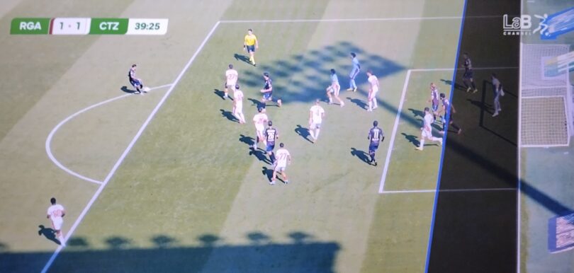 Veniamo alla contro-copertina. Siamo al 74° e il Catanzaro concede l’ennesimo contropiede: Reinhart, di spalle, lancia dalla destra della linea centrale verso la parte opposta, Cassandro prolunga verso Bozzolan, che s’invola solitario sulla sinistra e crossa al centro, dove Lambourde, solitario, insacca. Il guardalinee sotto la Tribuna Est alza subito la bandierina, ma il VAR lo smentisce: è Bettella a tenere in gioco, per pochi centimetri, Lambourde.