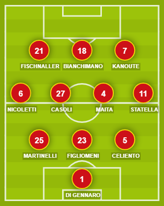 CATANZARO (3-4-3): 1 Di Gennaro; 5 Celiento, 23 Figliomeni, 25 Martinelli; 11 Statella, 4 Maita, 27 Casoli, 6 Nicoletti; 7 Kanoute, 18 Bianchimano, 21 Fischnaller. A disposizione: 12 Mittica, 14 Riggio, 16 Elizalde, 30 Pinna, 31 Quaranta, 3 Favalli, 13 Tascone, 26 Risolo, 9 Calì, 10 Giannone, 20 Di Livio, 28 Nicastro. Allenatore: Auteri.