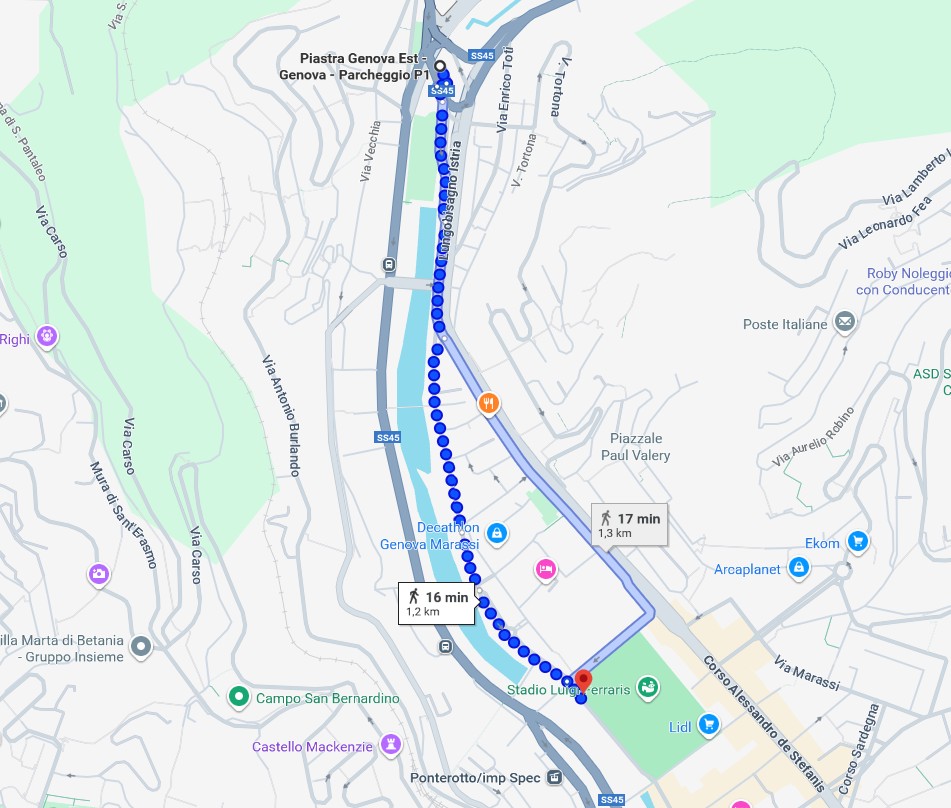 Dal parcheggio si arriva a piedi al settore ospiti (vedi immagine), con un percorso di poco più di un chilometro. L’apertura del settore è prevista per le 18:30, due ore prima dell’inizio della gara.