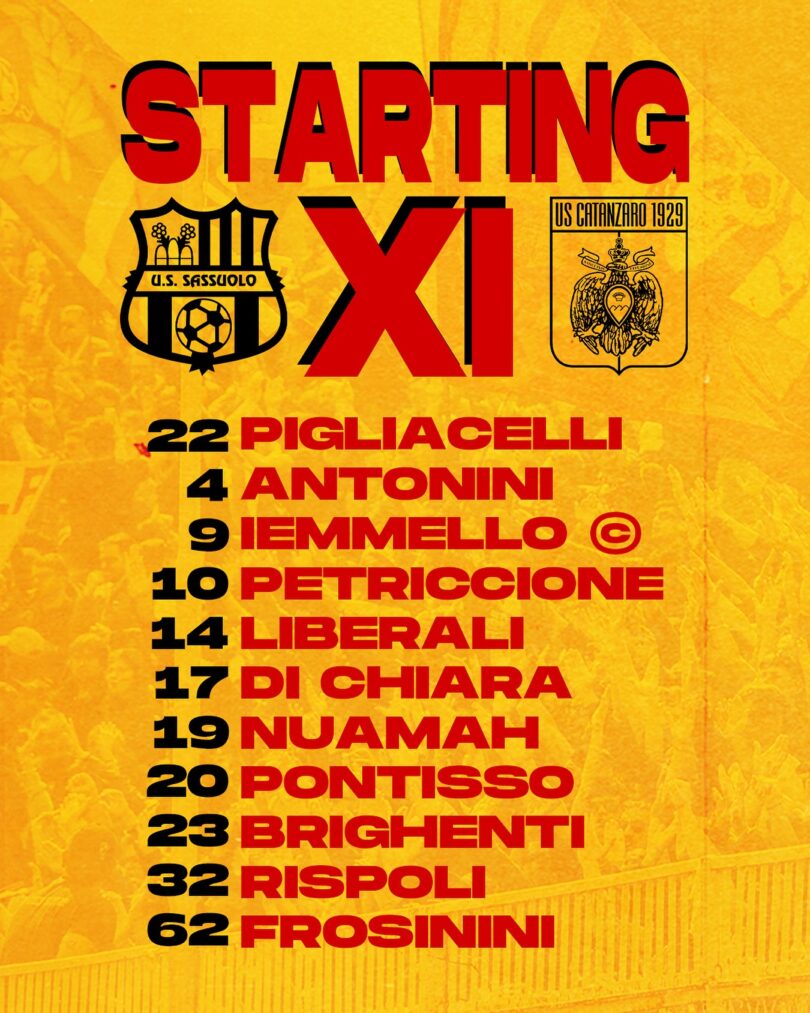 Questi gli undici di partenza, schierati con un 4-3-3 in fase di non possesso, che dovrebbe diventare un 3-4-2-1 in fase di attacco: Pigliacelli; Frosinini, Brighenti, Antonini, Di Chiara; Pontisso, Petriccione, Rispoli; Liberali, Iemmello, Nuamah.