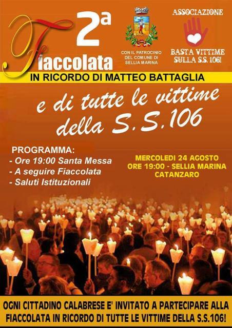 L’Associazione “Basta Vittime Sulla Strada Statale 106” e l’Associazione “Amici di Danilo” di Badolato ancora scossi per l’ennesima tragedia avvenuta nei giorni scorsi sulla S.S.106 confermano la seconda Fiaccolata in ricordo di Matteo Battaglia, diVittoria, Lorena, Pasquale e di tutte le vittime della S.S.106 in Calabria e rilanciano un appello rivolto alle istituzioni affinché possano assumere interventi urgenti di messa in sicurezza e di ammodernamento ormai necessari e non più rinviabili sulla “strada della morte”.