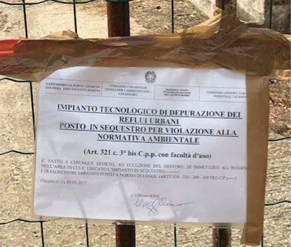 Nel corso del sopralluogo, secondo quanto reso noto, sarebbero emerse “gravi criticità e difformità” dell’impianto dalle prescrizioni di legge “tali da creare inequivocabile un impatto negativo sul corpo recettore dei fluidi in uscita, consistente nel “fosso Coschino”, che a sua volta alimenta il fiume Amato”. Ritenuto sussistente il fondato pericolo che il depuratore potesse continuare ad alimentare l’inquinamento idrogeologico dell’area circostante, si è proceduto al sequestro preventivo dell’impianto, con sua facoltà d’uso per ragioni di pubblica utilità, ed alla denuncia dell’amministratore unico della società capogruppo del raggruppamento Temporaneo di Imprese affidatarie del servizio di gestione dell’impianto di depurazione dei reflui urbani del comune di Platania.