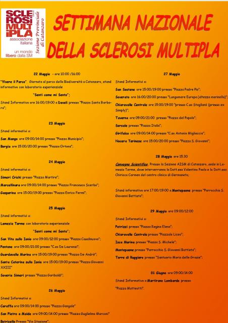 La settimana proseguirà con una serie di appuntamenti nei vari comuni del catanzarese, tra i quali, il 23 Maggio a San Mango e Borgia, il 24 Maggio a Simeri Crichi, Marcellinara e Gasperina; un altro laboratorio esperienziale “Senti come mi sento” si terrà il 25 maggio a Lamezia Terme e nello stesso giorno stand informativi a San Vito sullo Ionio, Pentone, Guardavalle, Santa Caterina sullo Ionio e Soveria Simeri; si prosegue il 26 a Caraffa e San Pietro a Maida, il 27 Maggio a San Sostene, Soverato, Chiaravalle Centrale, Taverna, Sersale, Girifalco e Nocera Terinese; il 28 Maggio si prosegue con un importante convegno scientifico, presso la sede Aism di Catanzaro sita in Via B.Sposato Lamezia Terme, dove interverranno Paola Valentino e Carmen Chiriaco del Policiclico Universitario – Campus Germaneto. Nello stesso giorno stand informativo a Montepaone. Il 29 Maggio l‘ Associazione sarà presente nei comuni di Petrizzi, Chiaravalle Centrale, Isca Marina, Montepaone e Torre di Ruggiero.