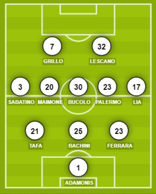 SICULA LEONZIO (3-5-2): 1 Adamonis; 23 Ferrara, 25 Bachini, 21 Tafa; 17 Lia, 23 Palermo, 30 Bucolo, 20 Maimone, 3 Sabatino; 32 Lescano, 7 Grillo. A disposizione: 12 Governali, 22 Fasan, 13 Parisi, 15 Ferrini, 16 De Rossi, 19 Sosa, 4 Sicurella, 10 Provenzano, 9 Catania, 11 Scardina, 14 Bariti, 18 Terranova. Allenatore: Grieco.