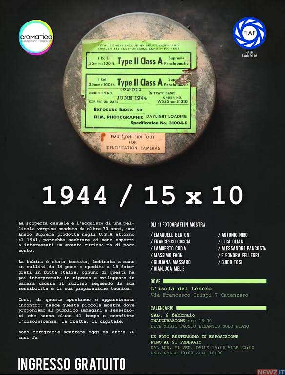 Dopo essere stata esposta in diverse città italiane, approda anche a Catanzaro, su iniziativa dell’associazione fotografica “Cromatica”, la Mostra fotografica “1944 / 15 x 10”, patrocinata Fiaf, che sarà inaugurata sabato 6 febbraio alle ore 18 presso la libreria “Isola del Tesoro” (via Francesco Crispi 7).
