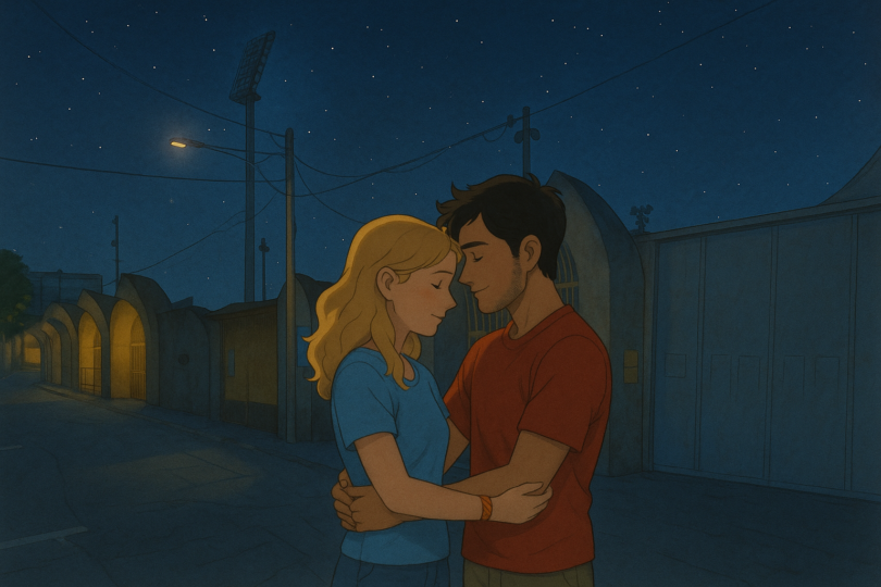 L’aria era ferma, la città vuota, sospesa tra il tramonto e la notte. I bar avevano già chiuso i battenti, i tavolini spariti, le vetrine abbassate a metà. Ma in quella quiete irreale, tutto sembrava più intimo, più loro.