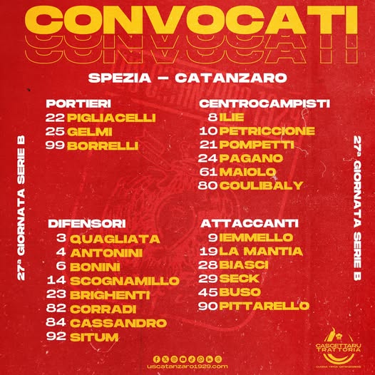 Nessuna sorpresa per il match-clou della 27a giornata: a Spezia vanno tutti, eccetto lo squalificato Simone Pontisso e gli infortunati Marco D’Alessandro e Mattia Compagnon (che dovrebbe tornare la prossima settimana ad allenarsi in gruppo).
